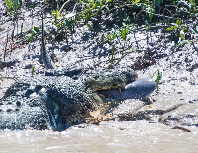 Khi đang đi dạo trên bờ sông Adelaide (Australia), nhiếp ảnh gia Andrew Paice đã ghi lại được một khoảnh khắc cực hiếm trong thế giới động vật hoang dã. Đó chính là cảnh cá sấu nước mặn nuốt gọn cá mập bò. Theo Andrew Paice, con cá mập bò có chiều dài khoảng 1,5m. Thế nhưng, nếu so với độ dài khoảng 5,5m của con cá sấu thì nó chỉ là một miếng mồi béo bở cho “gã bò sát khổng lồ”.