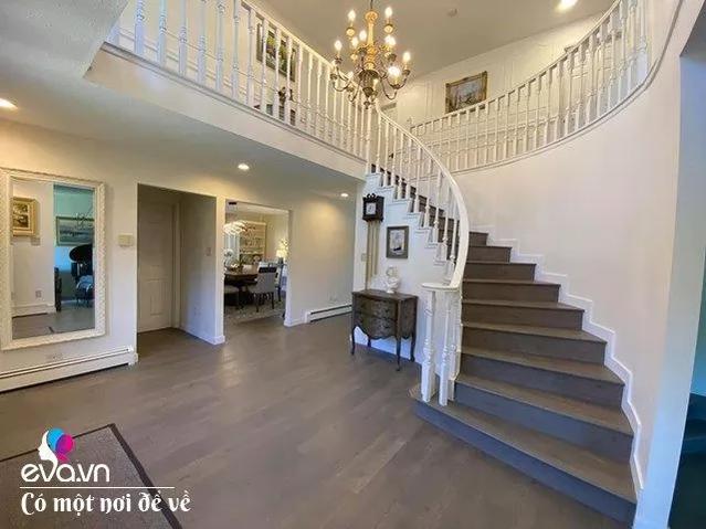 Không gian nhà thoáng đãng khiến mỗi vị khách tới nhà đều cảm nhận được sự rộng rãi của căn nhà. Chị Trang thay toàn bộ sàn nhà và cầu thang sang gỗ tự nhiên. Nhìn từ đây thấy phòng đóng cửa là phòng làm việc, bên cạnh là phòng Dining room, ngay cạnh cầu thang là phòng lớn để piano, đằng sau cầu thang là phòng bếp, ăn sáng, Guest bathroom, phòng máy giặt, và 1 phòng sinh hoạt để tivi. Còn 2 bên cửa ra vào là 2 tủ cao để giầy và áo khoác.