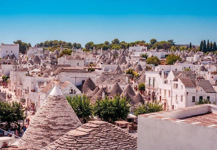 Tại thị trấn Alberobello, những ngôi nhà được xây dựng theo kiến trúc Trulli. Đây là kiểu kiến trúc dân gian Nam Ý với mái hình nón màu xám, bên ngoài được quét vôi màu trắng tinh khôi và trên mái đôi khi sẽ là hình vẽ trừu tượng mang những tín ngưỡng khác nhau.