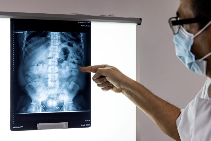 Bác sĩ Karim Hamiche chỉ vào túi cocaine trong ổ bụng của một người vận chuyển trái phép, ở bệnh viện Cayenne, Guiana thuộc Pháp, ngày 14/10/2022. Ảnh: AFP.