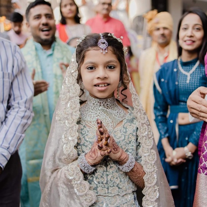 Devanshi Sanghvi, 8 tuổi, trong một buổi lễ trước khi cạo đầu đi tu tuần này. Ảnh: India Times