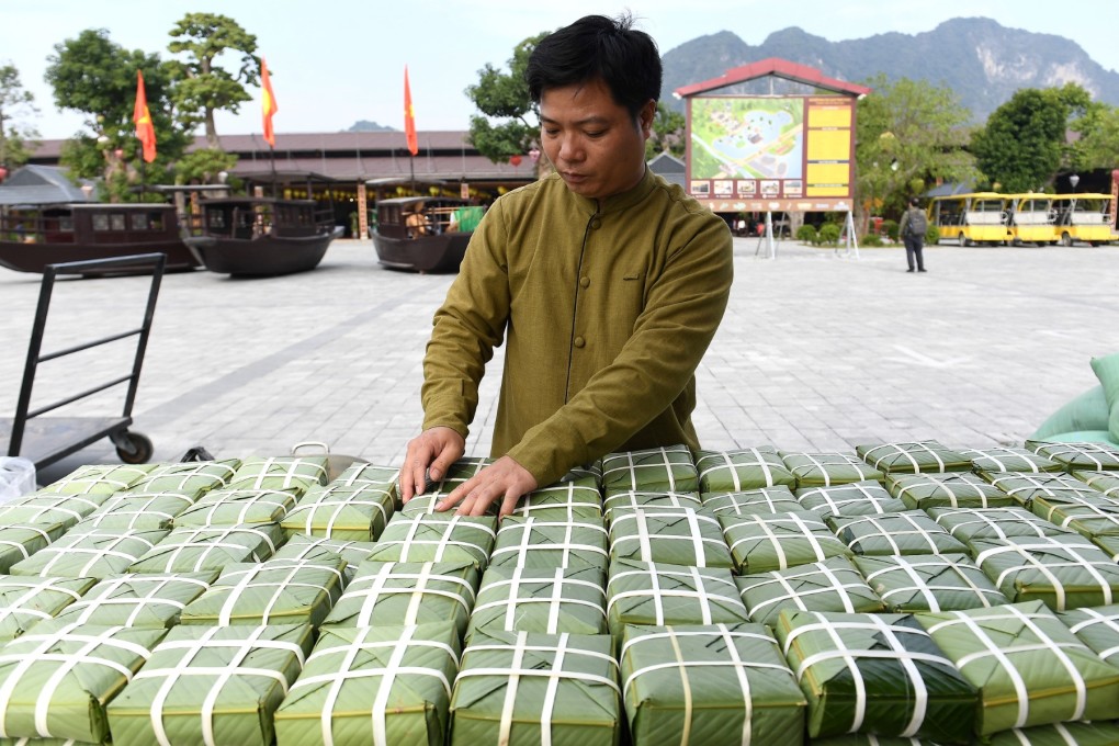 Hoạt động gói bánh chưng giáp Tết tại chùa Tam Chúc, tỉnh Hà Nam, ngày 7/1. Ảnh: AFP.
