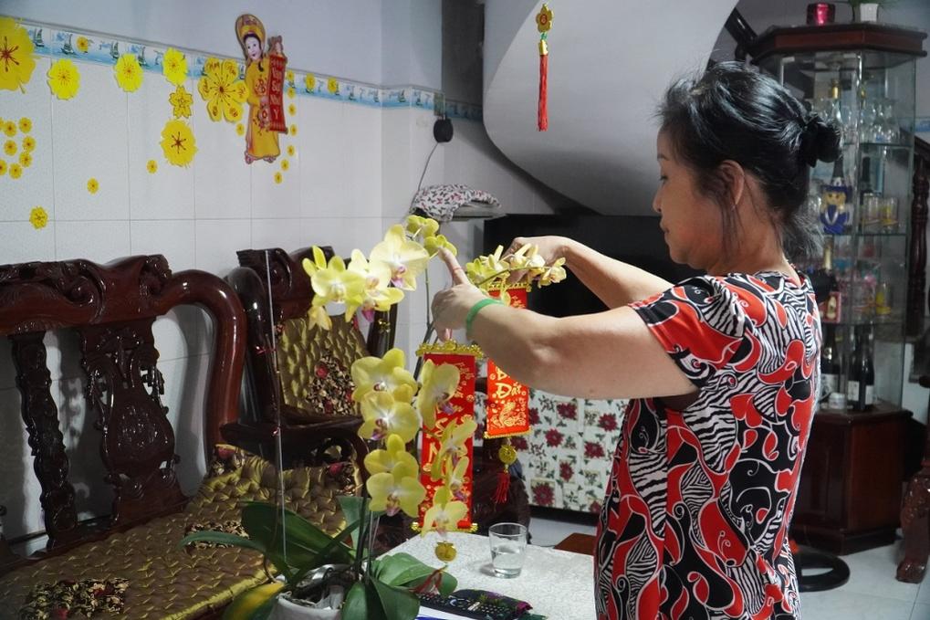 Bà Nguyễn Lan Hương tự tay trang trí Tết trong nhà tại quận Phú Nhuận tối 18/1. Ảnh: Minh Tâm.