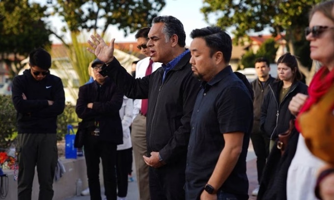 Người dân cầu nguyện gần hiện trường vụ xả súng ở Monterey Park, California, Mỹ, ngày 22/1. Ảnh: Reuters.