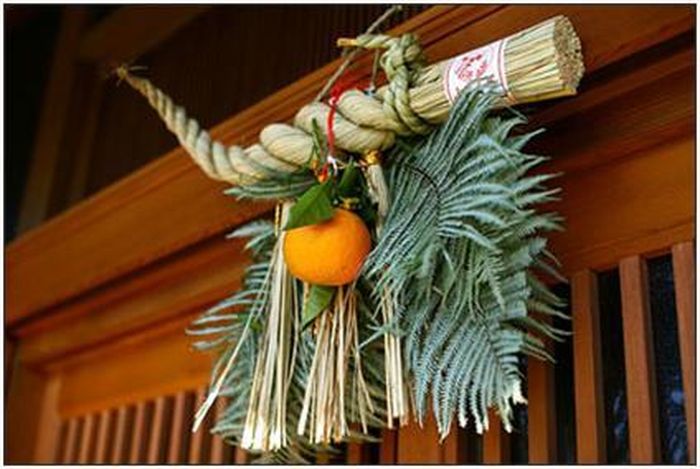 Ðón năm mới, người Nhật thường treo một vòng làm bằng rơm khô có tên là shimenawa trước cửa nhà vì đó là biểu tượng của niềm vui và may mắn. Ngoài ra, mọi nhà cũng đều trang trí cây tùng trước cửa được gọi là Kadomatsu vì theo tín ngưỡng cổ truyền thì vị thần Toshigami-sama sẽ hạ giới và trú ẩn trong cây này.