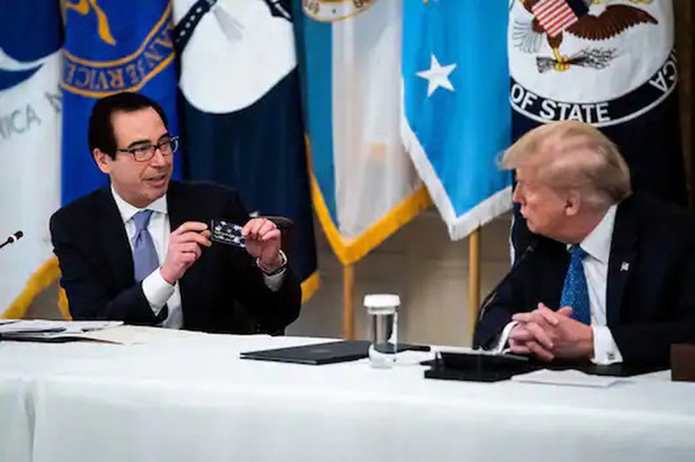 Cựu Bộ trưởng Tài chính Mỹ, ông Steven Mnuchin, giơ lên cho cựu Tổng thống Donald Trump xem một chiếc thẻ được dùng để gửi tiền hỗ trợ cho người Mỹ trong một cuộc họp nội các tại Nhà Trắng hồi tháng 5-2020. Ảnh: The Washington Post