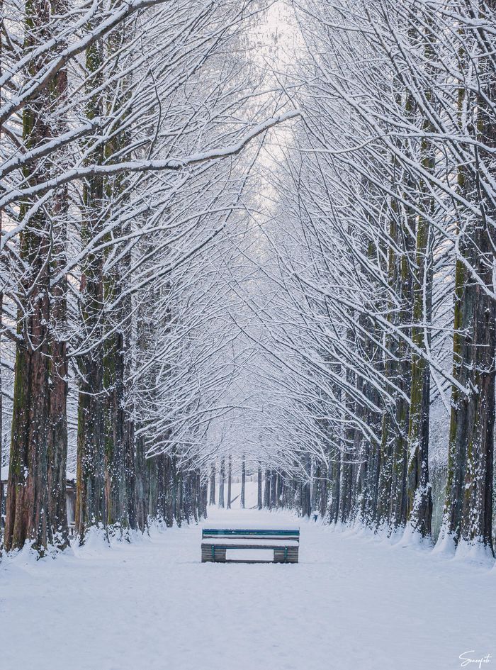 Địa điểm đầu tiên mà Ngọc Sơn đến là con đường thủy sam ở Damyang, tỉnh Jeollanam-do - Một trong những con đường thủy sam đẹp nhất của Hàn Quốc. Thời điểm anh tới là vào 6 giờ sáng, khi đó tuyết vẫn còn rơi. Sơn nằm trong xe vừa ngắm tuyết rơi vừa nhâm nhi cốc trà gừng pha mật ong đã chuẩn bị sẵn ở nhà và chờ bình minh lên.