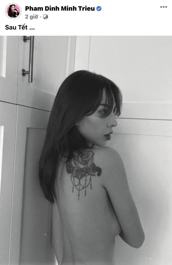 Trên trang cá nhân, Minh Triệu đăng tải bức hình đen trắng tạo dáng cực sexy. Cô khéo léo khoe vòng 1 hờ hững với hình xăm hoa hồng nổi bật trên vai. Khoảnh khắc trên đã nhanh chóng thu hút sự chú ý của công chúng khiến ai nấy đều "u mê".