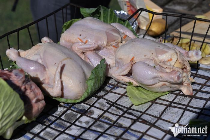 Sau khoảng 3 giờ, lớp đất được đào lên lộ ra giỏ đựng thức ăn nóng hổi.