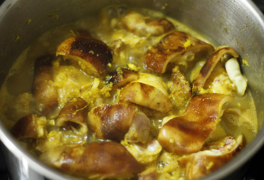 Nấu lửa 1: Xào săn thịt móng giò, chân giò đã ướp cho thấm gia vị trong 5 - 7 phút. Sau đó, cho nước ngập mặt thịt, đun sôi rồi hạ lửa nhỏ vừa ninh trong 25 - 30 phút. Tắt bếp cho thịt nguội.