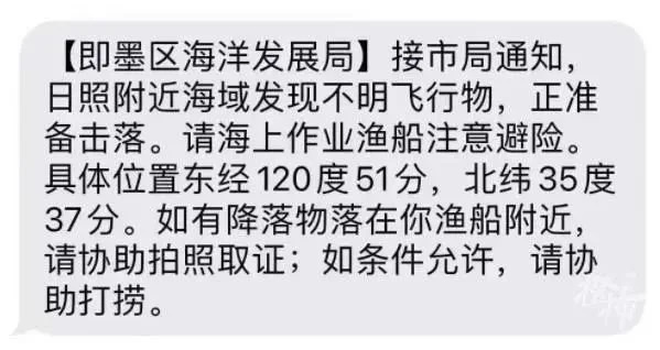 Ngày 12/2, Cục Phát triển Hải dương quận Tức Mặc, Thanh Đảo đã phát đi tin nhắn cảnh báo ngư dân ở vùng biển Nhật Chiếu về một vật thể bay không xác định, theo Paper.