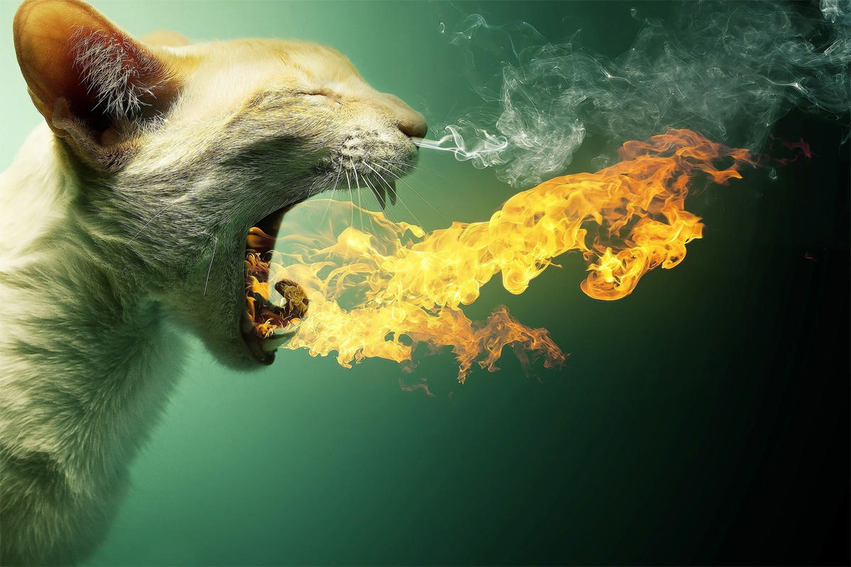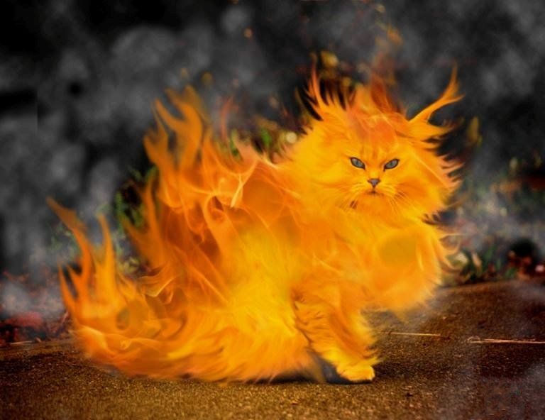 Mèo chạy thục mạng vì bị đốt nóng, lại bị thúc đuổi đằng sau khiến cho cây cối bốc cháy, rào chắn, đồn lũy bằng tre bị thiêu rụi.