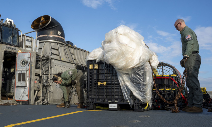 Không quân Mỹ điều tiêm kích tàng hình F-22 phóng tên lửa, bắn hạ khí cầu Trung Quốc trên vùng biển ngoài khơi bang Nam Carolina hôm 4/2. Hải quân Mỹ sau đó triển khai tàu thu hồi xác khí cầu trên biển. Lầu Năm Góc tuyên bố Mỹ sẽ không trả xác khí cầu cho Trung Quốc.