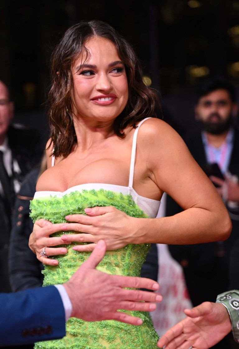 Mỹ nhân phim Lọ lem nhiều lần phải chỉnh lại váy, dùng tay đỡ ngực và kéo đầm lên để tránh nó bị tụt quá sâu. Vì xử lý kịp thời nên Lily James đã ngăn không để xảy ra một thảm họa trang phục trên thảm đỏ.