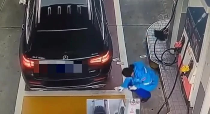 Theo đoạn clip, một chiếc ô tô Mercedes màu đen dừng lại ở một cây xăng để đổ nhiên liệu. Sau khi đổ đầy bình xăng cho chiếc xe, nữ nhân viên đã tiến về phía tài xế để thu tiền.
