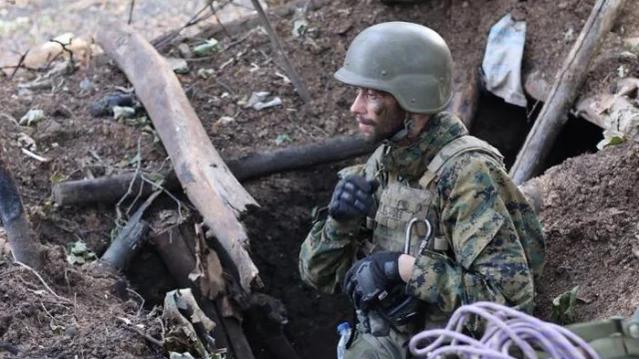 James Dee, 30 tuổi trong một chiến hào ở chiến trường Donbass, miền Đông Ukraine. Ảnh INews.