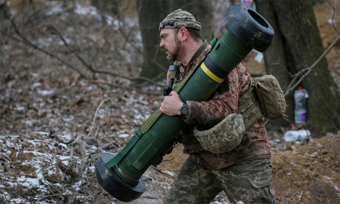 Lính Ukraine cầm ống phóng tên lửa Javelin ở ngoại ô Kiev tháng 3/2022. Ảnh: Reuters.