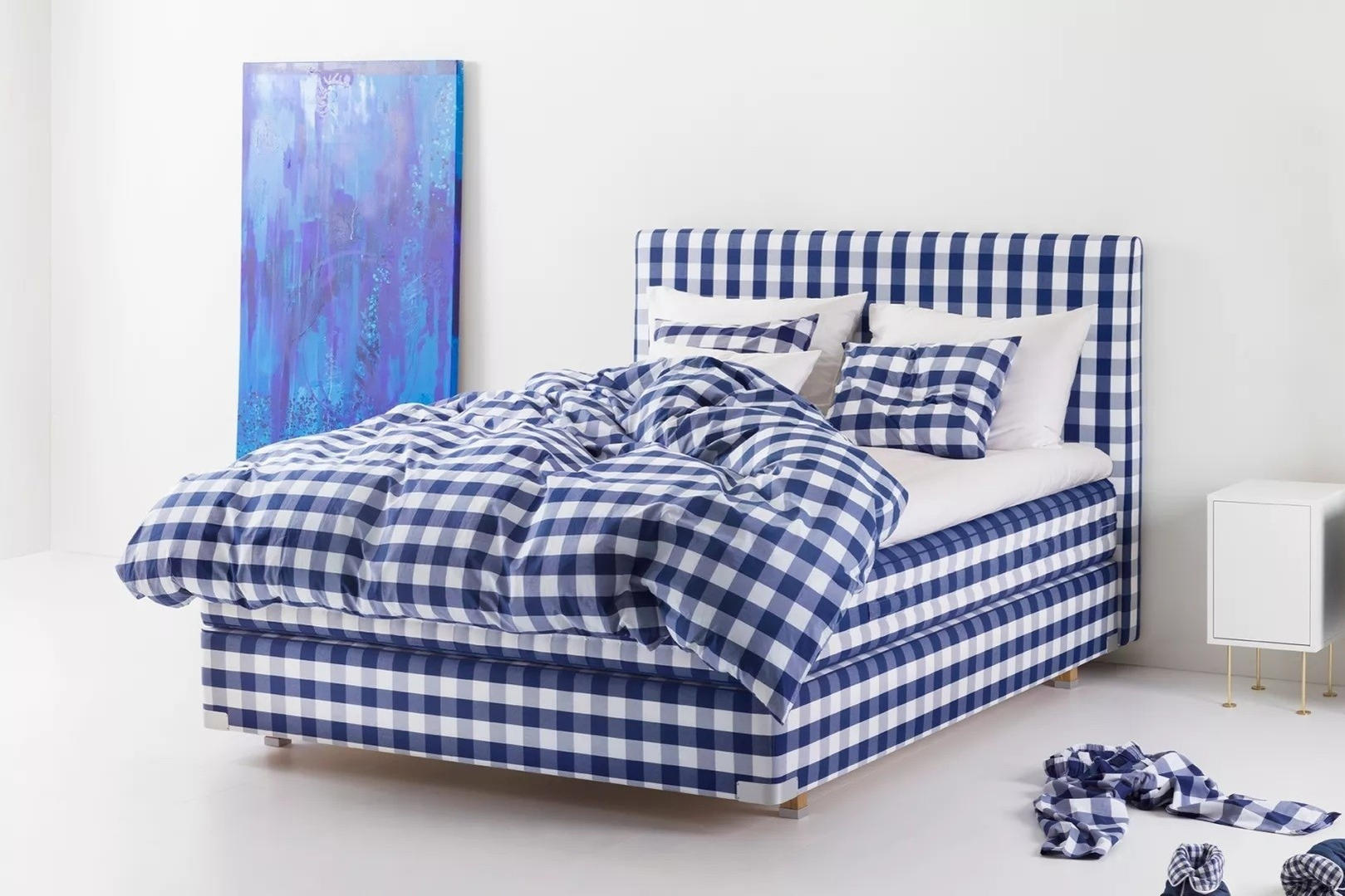 Các bộ phận của giường, từ chân đế, nệm đến lớp phủ trên cùng đều được bọc trong cùng loại vải màu xanh lam đặc trưng. Trong dịp kỷ niệm gần đây, hãng Hästens cũng đã tuyên bố thiết kế kẻ caro màu xanh lam là sản phẩm mang tính biểu tượng của thương hiệu.