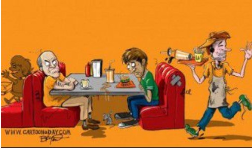 Một tên nhìn sang bàn bên cạnh thấy ông khách đang bực tức vò đầu bứt tóc, quay lại hỏi bạn: