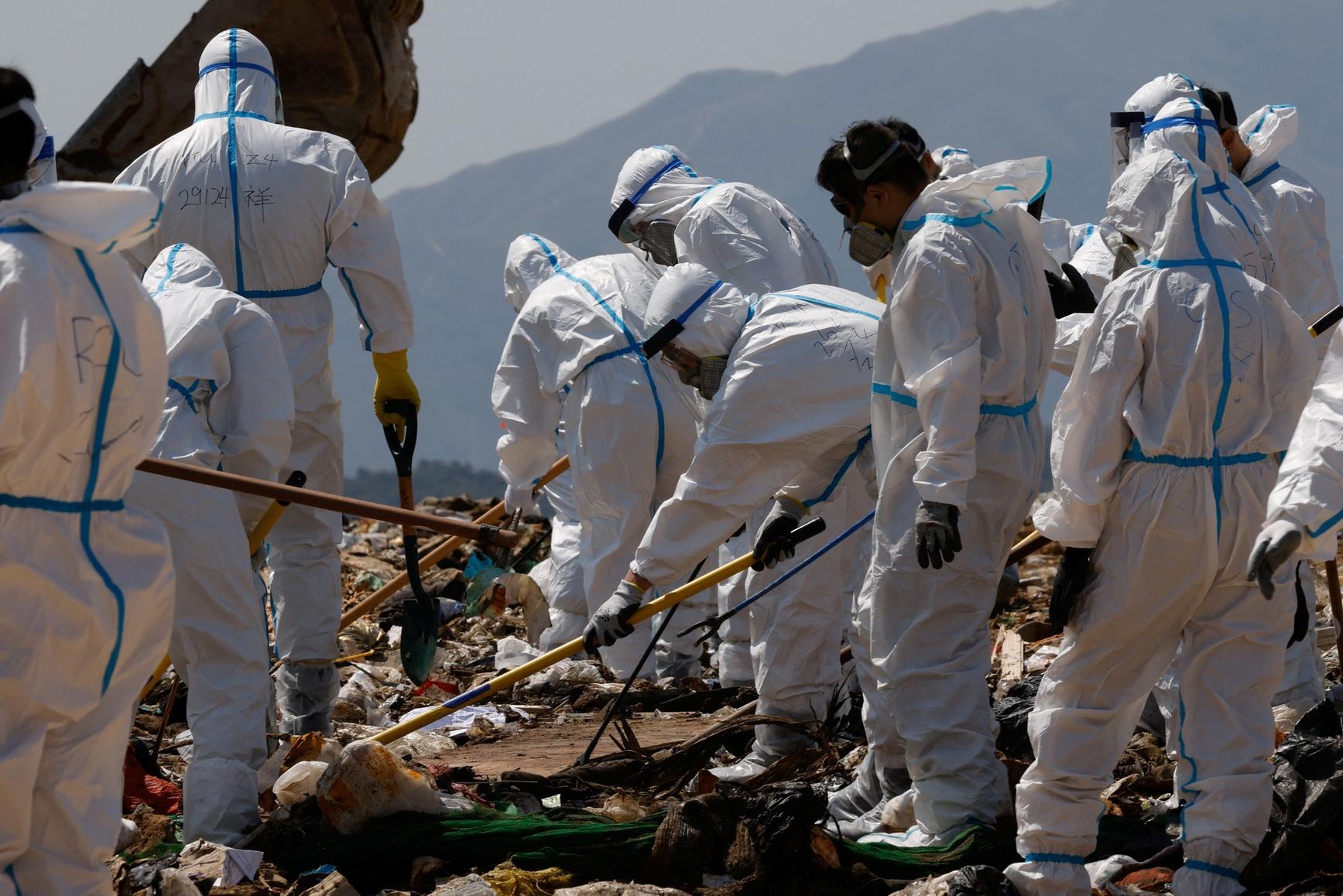 Cảnh sát đào bới bãi rác để tìm kiếm các bộ phận còn thiếu trên thi thể của người mẫu Abby Choi. Ảnh: Reuters.