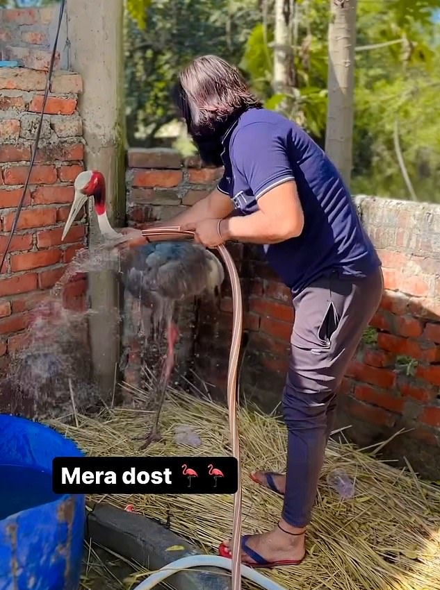 Arif tắm cho con sếu và gọi nó là 'bạn'. Ảnh cắt từ video