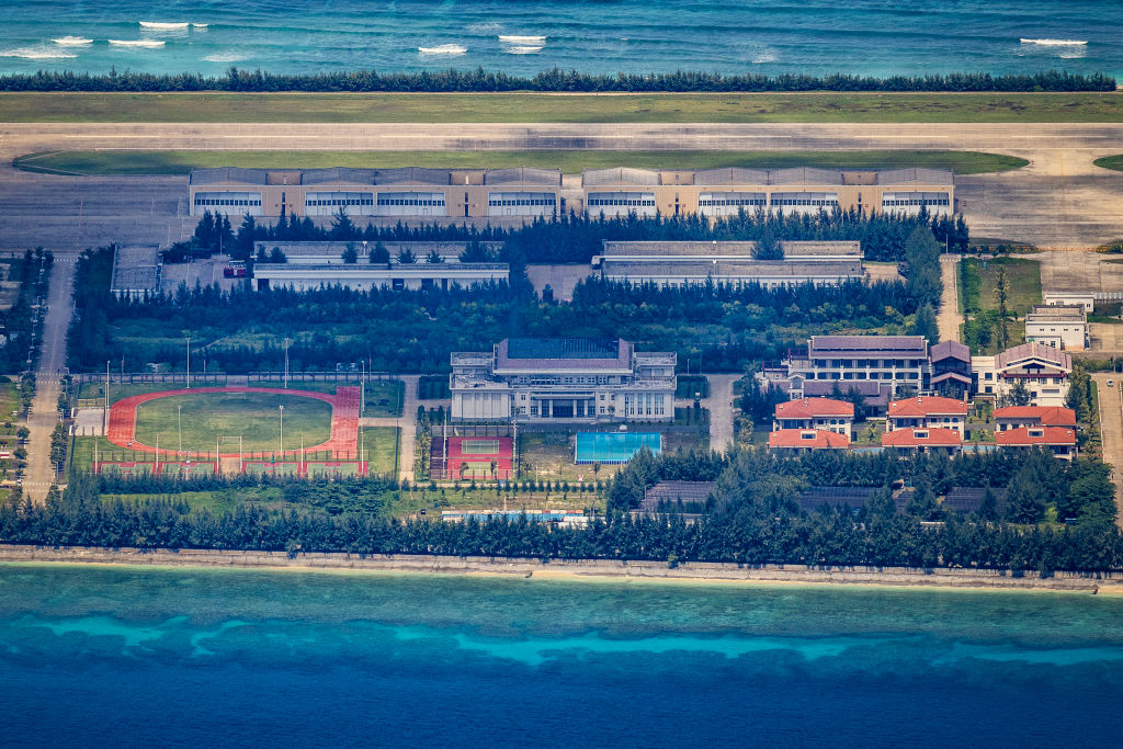 Phi trường và các công trình quân dân sự mà Trung Quốc xây dựng trên đảo nhân tạo Đá Chữ Thập (Fiery Cross Reef) thuộc quần đảo Trường Sa được nhìn thấy hôm 25/10/2022. Ảnh Ezra Acayan/Getty Images