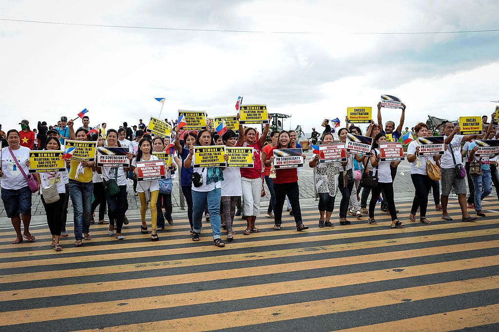 Người dân Philippines biểu tình trước đại sứ quán Trung Quốc tại Manila để phản đối yêu sách chủ quyền của Bắc Kinh ở Biển Đông hôm 12 Tháng Bảy 2016 – ngày mà Tòa Trọng tài Quốc tế The Hague ra phán quyết khẳng định các yêu sách chủ quyền của Trung Quốc là bất hợp pháp, không phù hợp với Công ước LHQ về Luật Biển (UNCLOS) mà Bắc Kinh đã ký kết. Ảnh Dondi Tawatao/Getty Images