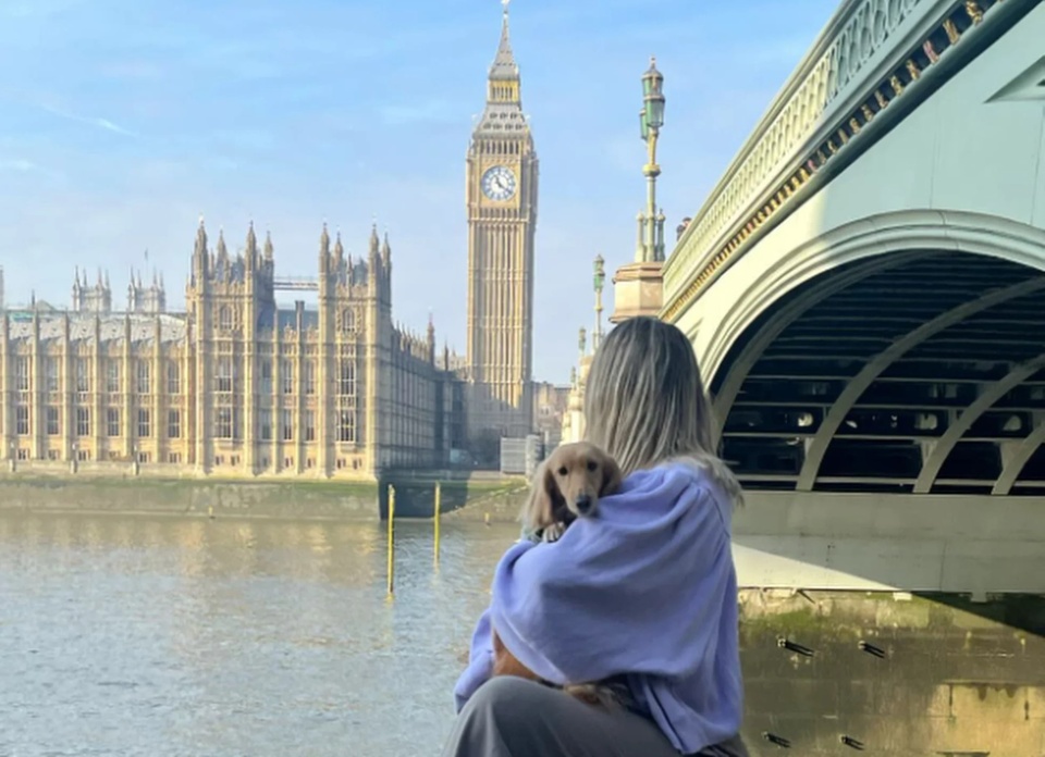 Con chó được chụp ảnh với chủ nhân của mình đối diện với Tòa nhà Quốc hội và tháp đồng hồ Big Ben ở London (Anh). Ảnh: Fifilittledarling.