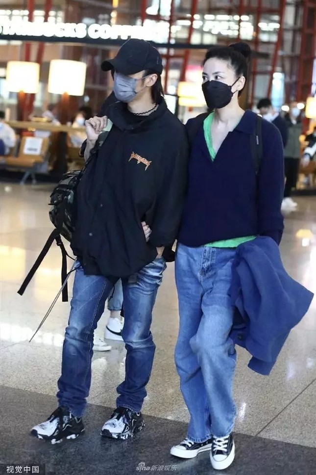 Tạ Đình Phong và Vương Phi ăn mặc đơn giản, khoác tay nhau tại sân bay (Ảnh: Sina)