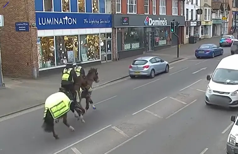 Trong một video từ tài khoản Twitter ASPolice Roads Policing (RPU), có thể thấy hai cảnh sát cưỡi ngựa đuổi theo và chặn người lái chiếc ôtô màu bạc trên một con đường ở East Reach, Taunton, Guardian đưa tin hôm 16/3.