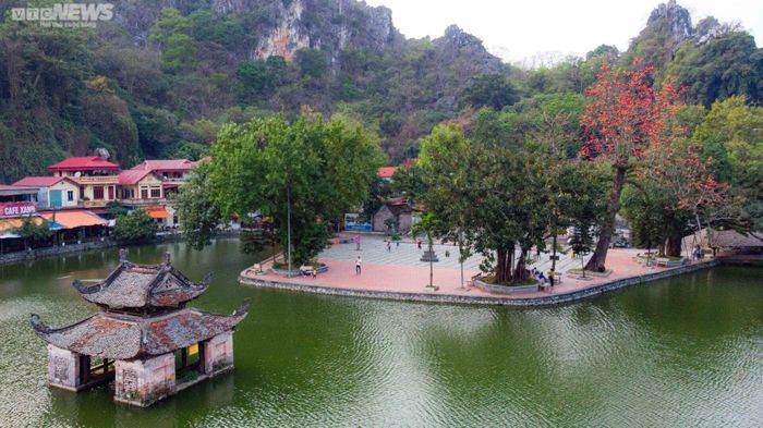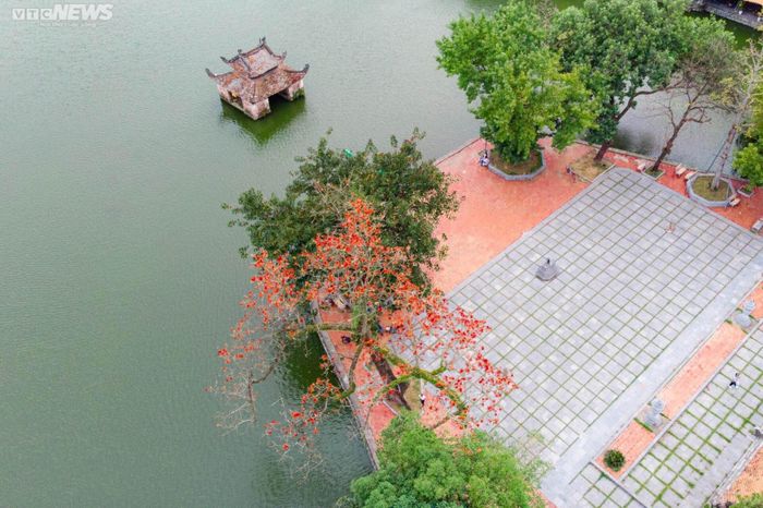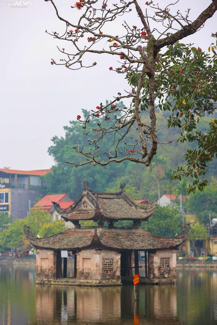Nhành hoa gạo sà xuống trước thủy đình trên hồ. Đây là một kiến trúc đặc sắc, hình ảnh tiêu biểu của Chùa Thầy. Thủy đình được sử dụng để múa rối nước, hiện vẫn còn sử dụng trong dịp lễ hội.