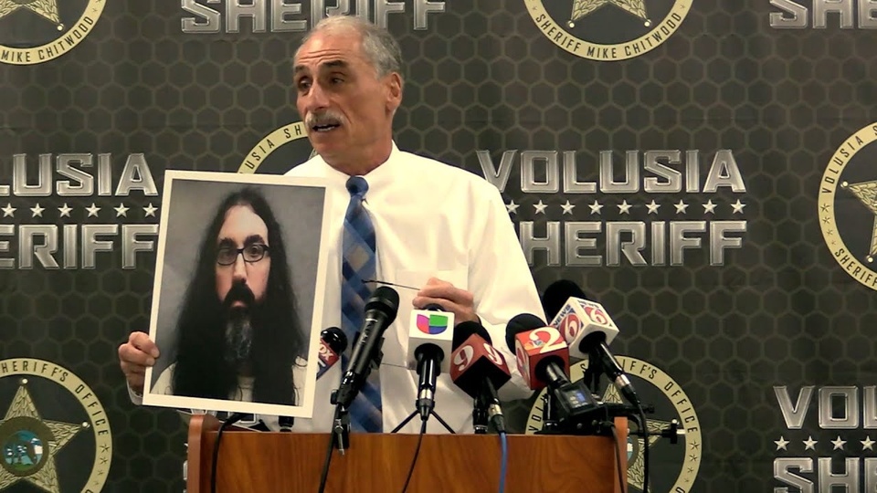 Cảnh sát trưởng hạt Volusia, Florida cùng chân dung của kẻ đã đe dọa ông. Ảnh: Vice.