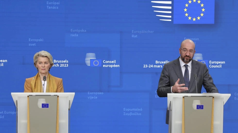 Chủ tịch Hội Đồng Châu Âu Charles Michel và chủ tịch Ủy Ban Châu Âu Ursula von der Leyen, tại thượng đỉnh Liên Âu, Bruxelles, ngày 23/03/2023. AP - Olivier Matthys