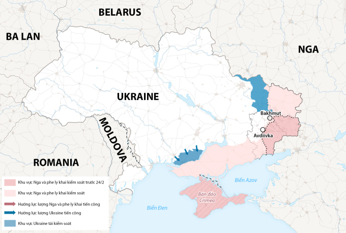 Giới chức Ukraine nói rằng Nga đã tăng cường áp lực lên các tuyến tiếp tế của Avdiivka, trong khi Bộ Quốc phòng Anh nhận định lực lượng Nga đang "đạt bước tiến chậm" ở quanh thành phố. Phát ngôn viên nhóm tác chiến - chiến lược Tavria của quân đội Ukraine tuần trước thừa nhận lực lượng Nga liên tục tìm cách bao vây Avdiivka và thành phố "có thể sớm trở thành Bakhmut thứ hai"