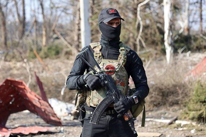 Một tay súng Wagner đứng gác ở thành phố Bakhmut. Ảnh: Tass