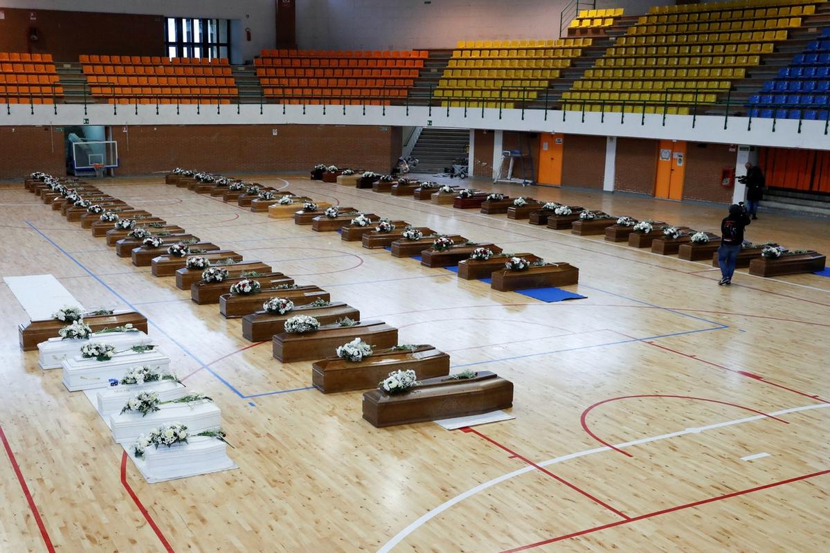 Quan tài của những người thiệt mạng trong vụ đắm tàu tại Palasport ở Crotone, Italy. Ảnh: Reuters.