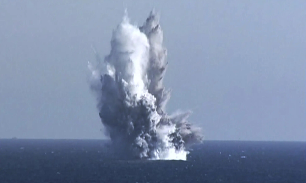 Vụ nổ giữa cuộc thử nghiệm phương tiện tấn công hạt nhân dưới nước của Triều Tiên trong ảnh công bố ngày 23/3. Ảnh: KCNA