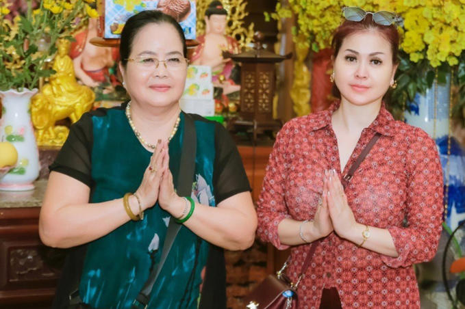 Yến Vy (phải) cùng mẹ đi làm thiện nguyện tại chùa ở Long An khi về nước gần đây. Ảnh: Tử Văn