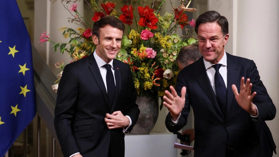 Tổng thống Pháp Emmanuel Macron (T) và thủ tướng Hà Lan Mark Rutte họp báo chung tại La Haye, Hà Lan ngày 30/01/2023. REUTERS - YVES HERMAN