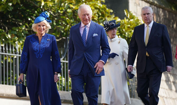 Vua Charles III, Hoàng hậu Camilla đi trước, phía sau là Hoàng tử Andrew và Công chúa Anne trong Lễ Phục sinh ngày 9/4/2023. Ảnh: Reuters