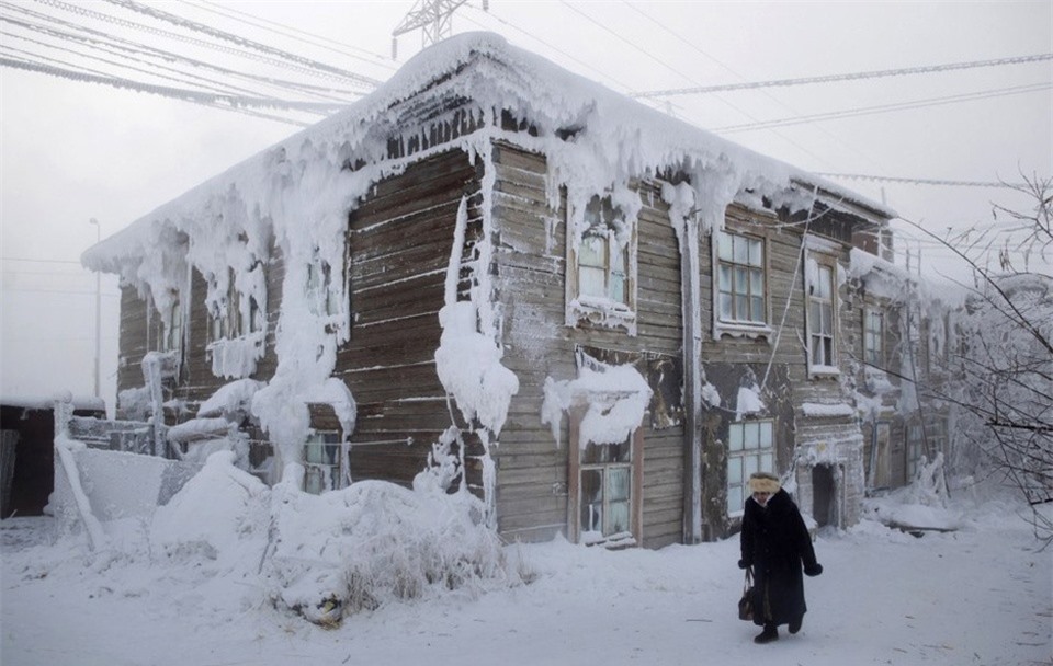 Nơi lạnh lẽo nhất: Oymyakon, CH Sakha (Nga): Làng Oymyakon, nơi sinh sống của khoảng 500 cư dân, được xem là địa điểm lạnh nhất trên thế giới. Nhiệt độ trung bình vào mùa đông của nơi này là âm 50 độ C, ban ngày chỉ kéo dài trong 3 tiếng. Tại quảng trường thị trấn, nhiệt độ thấp nhất từng được ghi nhận là âm 71,2 độ C vào năm 1924. Tuy nhiên, khi mùa hè đến, khí hậu sẽ ấm dần lên và có lúc lên đến 34 độ C. Ảnh: Wired.