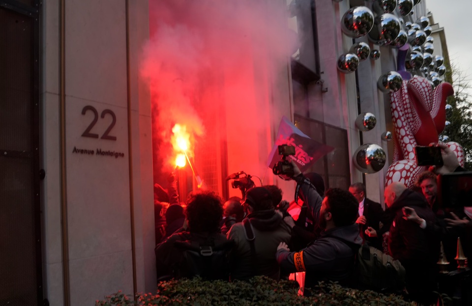 Một đoạn video ghi lại cảnh đám đông vẫy pháo sáng và biểu ngữ khi họ tràn qua lối vào trụ sở chính của LVMH trên Đại lộ Montaigne sang trọng ở trung tâm thủ đô Paris, Wall Street Journal đưa tin.