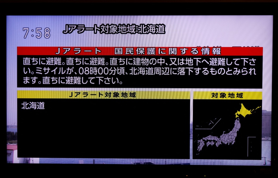 Chính phủ Nhật Bản ban đầu đă phát cảnh báo khẩn cấp J-Alert tại Hokkaido, yêu cầu người dân t́m kiếm nơi trú ẩn sau khi xuất hiện thông tin về tên lửa đạn đạo. Nhưng sau đó, cảnh báo này được nhà chức trách dỡ bỏ.