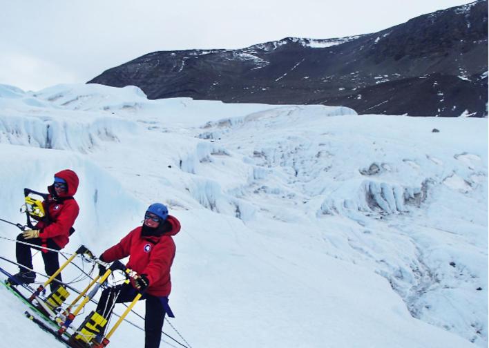 Các nhà nghiên cứu thu thập dữ liệu radar để lập bản đồ dòng chảy của hồ nước mặn nối Thác Máu và nguồn nước bên dưới sông băng. Ảnh: Cece Mortenson