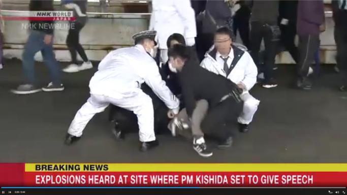 Theo như có một đoạn video quay cảnh lực lượng an ninh khống chế và bắt giữ một người đàn ông, chưa rõ có phải là nghi phạm ném bom khói hay không, sau khi có một vật thể dường như là bom khói bị ném vào Thủ tướng Nhật Bản Fumio Kishida ngày 15-4.