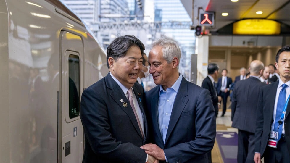 Ngoại trưởng Nhật Yoshimasa Hayashi (trái) rời ga Tokyo lên đường đến Karuizawa dự hội nghị các ngoại trưởng G7. Ảnh ngày 16/04/2023. AP - Andrew Harnik