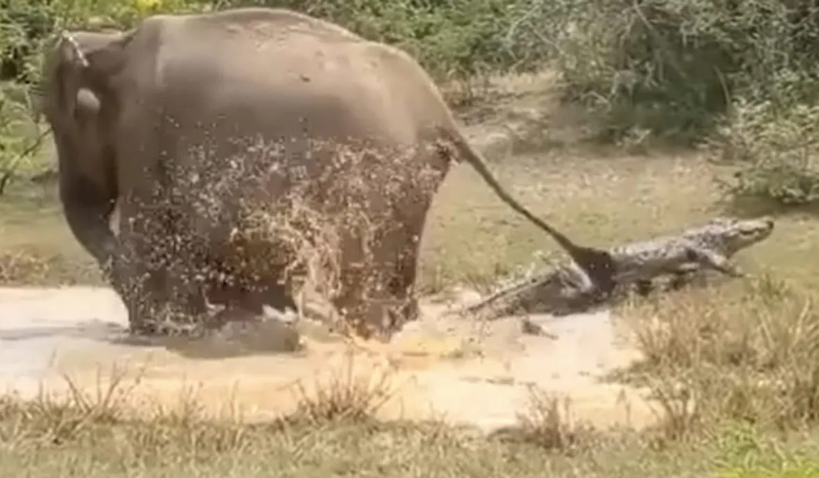 Voi mẹ quật cường chiến đấu với cá sấu để cứu con, kết quả cá sấu phải bỏ chạy thục mạng. Nguồn Twitter/Ndtv