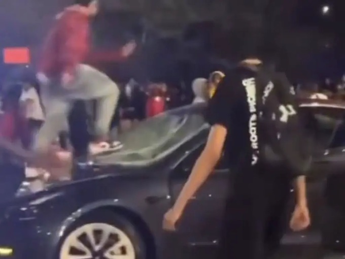 Nhóm thanh thiếu niên đập phá chiếc xe ở thành phố Chicago, bang Illinois đêm 15/4. Ảnh: NY Post