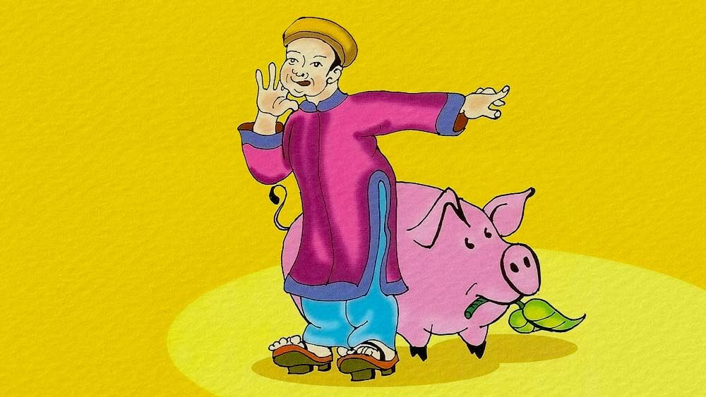 Vào đến nơi, quan chào vồn vã rồi sai lính lệ mang trầu ra mời. Anh ta cầm lấy miếng trầu, đút vào miệng con lợn, vái nó mấy vái mà rằng: