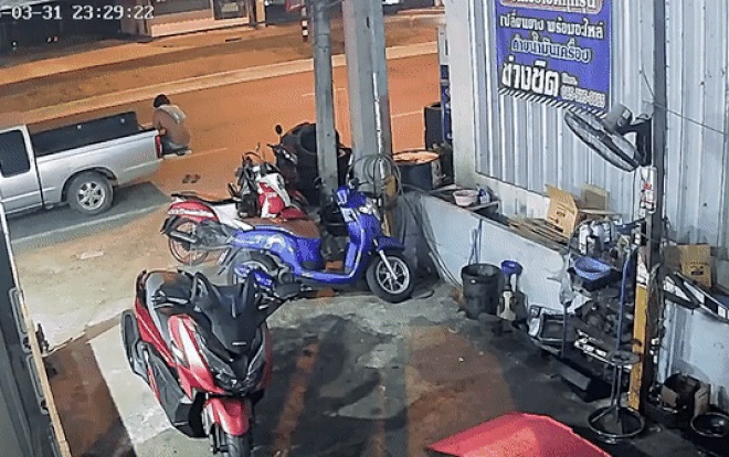 Theo đoạn clip trích xuất từ camera ghi lại, vụ việc xảy ra vào hôm 31/3, ngay trước một gara ô tô ở tỉnh Chanthaburi, Thái Lan.